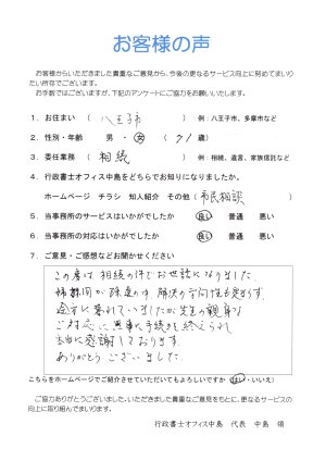 父が生前に相続について何も準備しないまま亡くなってしまったので、仕事で多忙な日々を送りながら様々な手続きを進めなければいけないことに気が重くなっていました。インターネットで相談先を探しているときに中島さんのHPを見つけ、ビジネスライクではないところにひかれ、お願いすることにしました。実際、中島さんは温かいお人柄で、親身になって対応してくださったことに感謝しております。また、税務に関しても、誠実に対応してくださる税理士さんを紹介してくださり、大変助かりました。ありがとうございました。