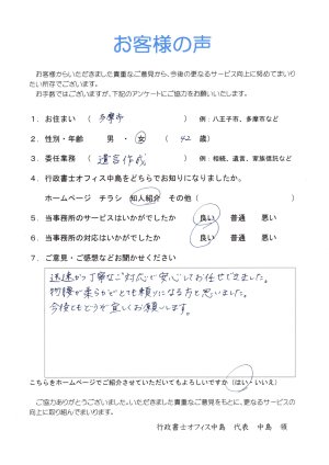 こちらの事情をじっくりと聞いてくださり、とても安心してお願いすることができました。対応もきめ細かく親切で、いろいろ無理を聞いていただきました。大切な書類をきちんと作ることができ、心から感謝しています。ありがとうございました。