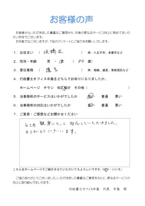 視力がなく体も不自由な私に対して、遺言書作成にあたり、説明及び手続などを丁寧に分かりやすく説明して頂き理解でき、また遺言書作成の必要書類もすべて揃えて頂きましたので公証人の方との遺言書作成の際、簡単に問題なくできたことに感謝いたしております。(以下略)