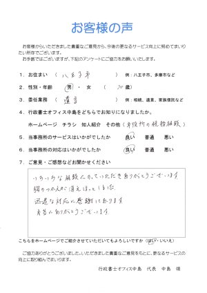 猛暑の中、迅速な手続き、また海外に居住している姉にも判りやすい説明等、ありがとうございました。司法書士の○○様にも宜しくお伝え下さい。手続きがスムーズにできて本当に感謝しております。